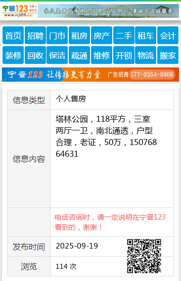 塔林公园,118平方,三室两厅一卫,南北通透,户型合理,老证,50万,15076864631