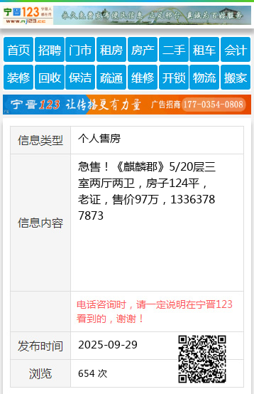 急售!《麒麟郡》5/20层三室两厅两卫,房子124平,老证,售价97万,13363787873