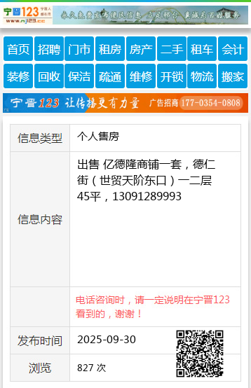出售 亿德隆商铺一套,德仁街(世贸天阶东口)一二层45平,13091289993