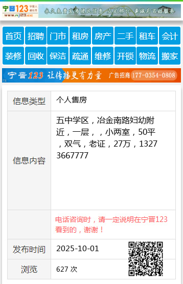 五中学区,冶金南路妇幼附近,一层,,小两室,50平,双气,老证,27万,13273667777