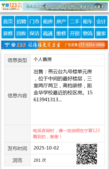 出售:燕云台九号楼单元房,位于中间的最好楼层,三室两厅两卫,高档装修,距金华学校最近的校区房。15613941313