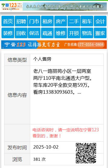 老八一路丽苑小区一层两室两厅110平南北通透大户型。带车库20平全款交易59万。看房13383093603。