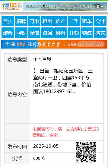 】 出售:旭阳花园东区,三室两厅一卫,四层153平方,南北通透,带地下室,价格面议18032997163