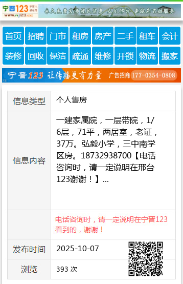一建家属院,一层带院,1/6层,71平,两居室,老证,37万。弘毅小学,三中南学区房。18732938700