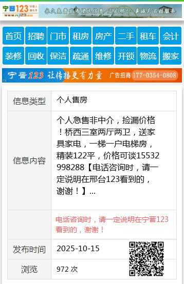 个人急售非中介,捡漏价格!桥西三室两厅两卫,送家具家电,一梯一户电梯房,精装122平,价格可谈15532998288 【电话咨询时,请一定说明在邢台123看到的,谢谢!】 |