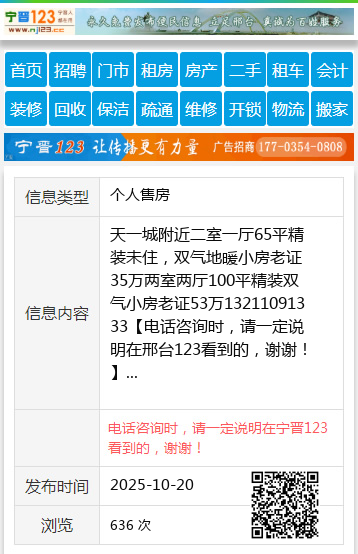 天一城附近二室一厅65平精装未住,双气地暖小房老证35万两室两厅100平精装双气小房老证53万13211091333 【电话咨询时,请一定说明在邢台123看到的,谢谢!】 |