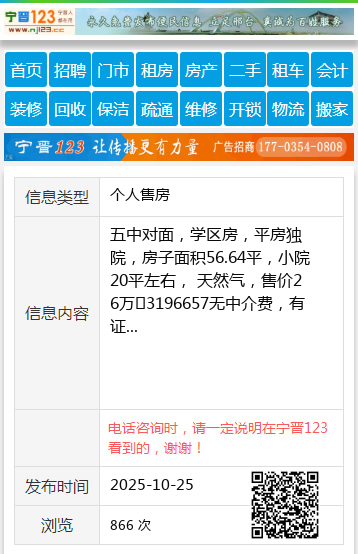 五中对面,学区房,平房独院,房子面积56.64平,小院20平左右, 天然气,售价26万☎3196657无中介费,有证