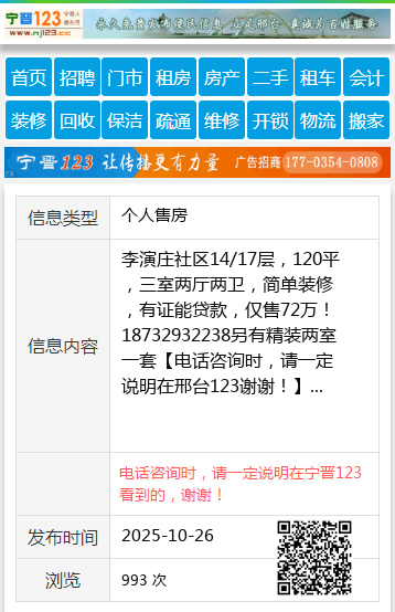 李演庄社区14/17层,120平,三室两厅两卫,简单装修,有证能贷款,仅售72万!18732932238另有精装两室一套