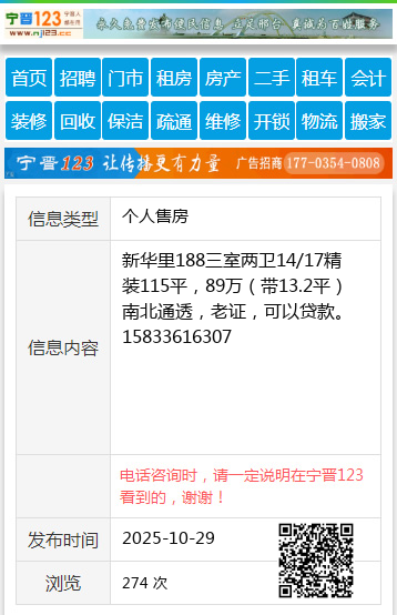 新华里188三室两卫14/17精装115平,89万(带13.2平)南北通透,老证,可以贷款。15833616307