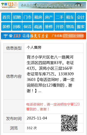 育才小学片区老八一路黄河生活区四层两室83平。老证43万。滨苑小区三层166平老证带车库75万。13383093603 【电话咨询时,请一定说明在邢台123看到的,谢谢!】 |