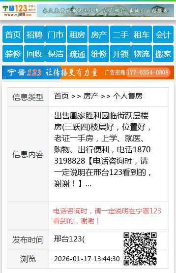出售凰家胜利园临街跃层楼房(三跃四)楼层好,位置好,老证一手房,上学、就医、购物、出行便利,电话18703198828 【电话咨询时,请一定说明在邢台123看到的,谢谢!】 |