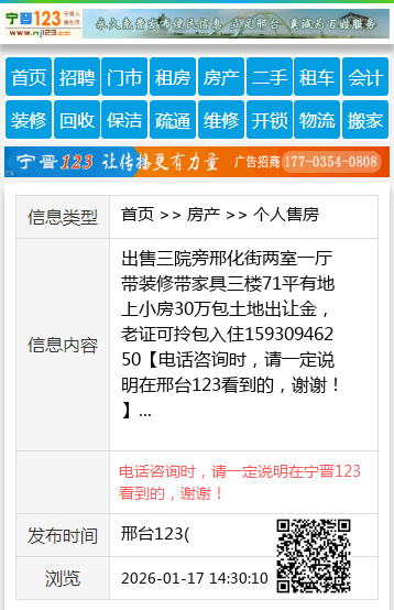 出售三院旁邢化街两室一厅带装修带家具三楼71平有地上小房30万包土地出让金,老证可拎包入住15930946250 【电话咨询时,请一定说明在邢台123看到的,谢谢!】 |