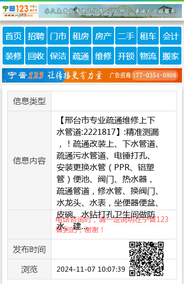 【邢台市专业疏通维修上下水管道:2221817】:精准测漏,!疏通改装上、下水管道、疏通污水管道、电锤打孔、安装更换水管(PPR、铝塑管)便池、阀门、热水器,疏通管道,修水管、换阀门、水龙头、水表,坐便器便盆、皮碗、水钻打孔卫生间做防水、建筑杂活疏通各种疑难下水道、上下水安装、空调移机加氟、挖凿门口、墙、地面,修装太阳能热水器,地暖暖气、地暖打压清洗,专业电工,电焊工上门服务,专业美缝,开锁换锁,家庭保洁, 地址、电话:2221817手机:13082026377 |