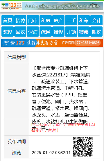 【邢台市专业疏通维修上下水管道:2221817】:精准测漏,!疏通改装上、下水管道、疏通污水管道、电锤打孔、安装更换水管(PPR、铝塑管)便池、阀门、热水器,疏通管道,修水管、换阀门、水龙头、水表,坐便器便盆、皮碗、水钻打孔卫生间做防水、建筑杂活疏通各种疑难下水道、上下水安装、空调移机加氟、挖凿门口、墙、地面,修装太阳能热水器,地暖暖气、地暖打压清洗,专业电工,电焊工上门服务,专业美缝,开锁换锁,家庭保洁 地址、电话:2221817手机:13082026377 |