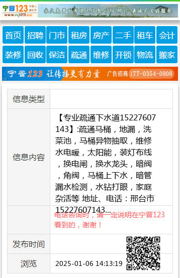 【管道疏通/按装暖气测漏打压/家庭电工15613967477:】:管道疏通/按装暖气测漏打压/家庭电工15613967477:疏通上下水管,坐便器,便池,污水井,下水道,改装疏通家庭上下污水管,按装维修卫浴,水管,水龙头,阀门,水表,按装维修厨柜,电锤水钻打眼,卫生间防水房顶防水,清洗地暖,更换分水器,地暖水管测漏,按装维修太阳能,太阳能维修清洗移机,按装维修热水器,油烟机,浴霸灯具维修,家庭电路维修更换插座,漏电保护器,开锁换锁,更换锁具。邢台市维修电话15613967477 地址、电话:邢台市维修电话15613967477