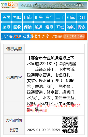 【邢台市专业疏通维修上下水管道:2221817】:精准测漏,!疏通改装上、下水管道、疏通污水管道、电锤打孔、安装更换水管(PPR、铝塑管)便池、阀门、热水器,疏通管道,修水管、换阀门、水龙头、水表,坐便器便盆、皮碗、水钻打孔卫生间做防水、建筑杂活疏通各种疑难下水道、上下水安装、空调移机加氟、挖凿门口、墙、地面,修装太阳能热水器,地暖暖气、地暖打压清洗,专业电工,电焊工上门服务,专业美缝,开锁换锁,家庭保洁, 地址、电话:2221817手机:13082026377 |