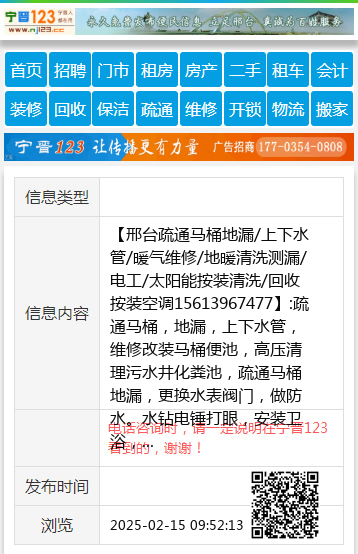 【邢台疏通马桶地漏/上下水管/暖气维修/地暖清洗测漏/电工/太阳能按装清洗/回收按装空调15613967477】:疏通马桶,地漏,上下水管,维修改装马桶便池,高压清理污水井化粪池,疏通马桶地漏,更换水表阀门,做防水。水钻电锤打眼,安装卫浴,马桶,地漏,浴霸,灯具,太阳能,热水器,油烟机。家庭电工,电路短路断路维修,更换电闸,漏电保护器。维修安装暖气,PPR水管维修,更换地暖分水器,安装排风扇,油烟机,地暖清洗测漏,空调移机维修清洗回收,热水器太阳能移机清洗维修,壁挂太阳能加装介质。 地址、电话:15613967477 管道疏通 |