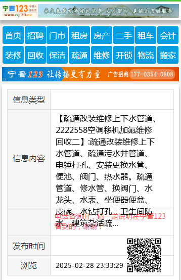 【疏通改装维修上下水管道、2222558空调移机加氟维修回收二】:疏通改装维修上下水管道、疏通污水井管道、电锤打孔、安装更换水管、便池、阀门、热水器。疏通管道、修水管、换阀门、水龙头、水表、坐便器便盆、皮碗、水钻打孔,卫生间防水,建筑杂活疏通管道 承接疏通各种疑难下水道、上下水安装 专业疏通改装上、下水管道、电锤打孔、便池阀门热水器。疏通管道修水管换阀门、水龙头、水表、坐便器便盆、皮碗、水钻打孔,家庭电工、卫生间防水、清洗地暖 精准测漏水 地暖 !!开换锁 !! 清洗太阳能 !!空调移机加氟维修!回收二手空调! 地址、电话:桥东15532929556桥西2222558 |