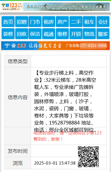 【专业步行梯上料,高空作业】:32米云梯车,28米高空载人车,专业承接广告牌拆装,外墙喷漆,玻璃打胶,园林修剪,上料,(沙子,水泥,瓷砖,门窗,玻璃,卷材,大家具等)下垃圾等业务,19528798884 地址、电话:邢台全区域都可到位