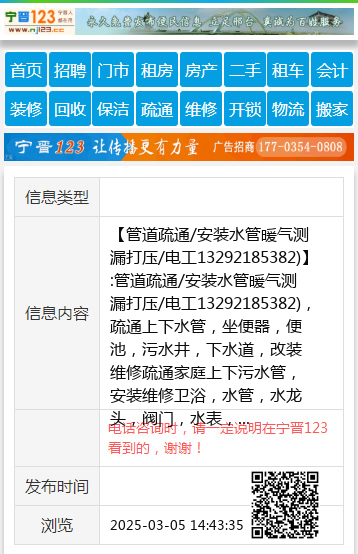 【管道疏通/安装水管暖气测漏打压/电工13292185382)】:管道疏通/安装水管暖气测漏打压/电工13292185382),疏通上下水管,坐便器,便池,污水井,下水道,改装维修疏通家庭上下污水管,安装维修卫浴,水管,水龙头,阀门,水表,安装维修橱柜,电锤水钻打眼,卫生间防水,房顶防水,清洗地暖,更换分水器,地暖水管测漏,安装维修太阳能,太阳能移机,安装维修热水器和液晶电视,按装维修洗衣机,油烟机,浴霸灯具维修,家庭电路维修更换插座,漏电保护器等,开锁换锁,更换锁具。服务电话13292185382 地址、电话:服务电话13292185382 |