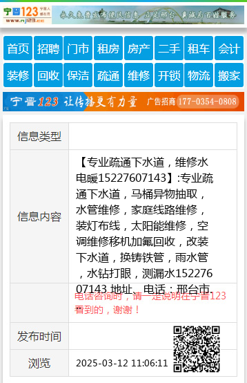【专业疏通下水道,维修水电暖15227607143】:专业疏通下水道,马桶异物抽取,水管维修,家庭线路维修,装灯布线,太阳能维修,空调维修移机加氟回收,改装下水道,换铸铁管,雨水管,水钻打眼,测漏水15227607143 地址、电话:邢台市15227607143