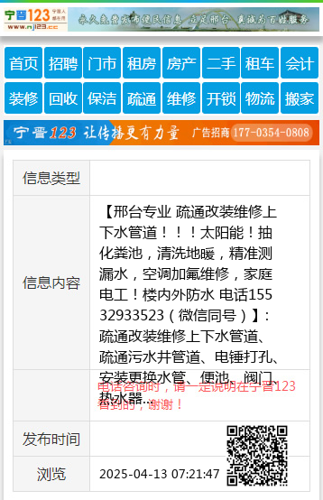 【邢台专业 疏通改装维修上下水管道!!!太阳能!抽化粪池,清洗地暖,精准测漏水,空调加氟维修,家庭电工!楼内外防水 电话15532933523(微信同号)】:疏通改装维修上下水管道、疏通污水井管道、电锤打孔、安装更换水管、便池、阀门、热水器。疏通管道、修水管、换阀门、水龙头、水表、坐便器便盆、皮碗、水钻打孔,卫生间防水,建筑杂活疏通管道 承接疏通各种疑难下水道、上下水安装 专业疏通改装上、下水管道、电锤打孔、便池阀门热水器。疏通管道修水管换阀门、水龙头、水表、坐便器便盆、皮碗、水钻打孔,家庭电工、卫生间防水、清洗地暖 精准测漏水 地暖 !!开换锁 !! 清洗太阳能 !!空调移机加氟维修!回收二手空调! 地址、电话:桥西:2225500 桥东:3171234 管道疏通 |