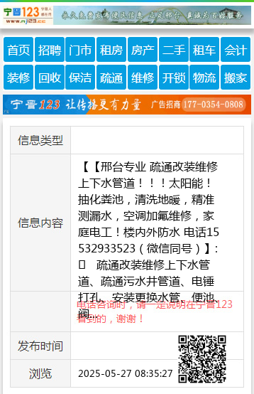 【【邢台专业 疏通改装维修上下水管道!!!太阳能!抽化粪池,清洗地暖,精准测漏水,空调加氟维修,家庭电工!楼内外防水 电话15532933523(微信同号)】: 疏通改装维修上下水管道、疏通污水井管道、电锤打孔、安装更换水管、便池、阀门、热水器。疏通管道、修水管、换阀门、水龙头、水表、坐便器便盆、皮碗、水钻打孔,卫生间防水,建筑杂活疏通管道 承接疏通各种疑难下水道、上下水安装 专业疏通改装上、下水管道、电锤打孔、便池阀门热水器。疏通管道修水管换阀门、水龙头、水表、坐便器便盆、皮碗、水钻打孔,家庭电工、卫生间防水、清洗地暖 精准测漏水 地暖 !!开换锁 !! 清洗太阳能 !!空调移机加氟维修!回收二手空调!! 地址、电话:桥西:2225500 桥东:3171234 管道疏通 |