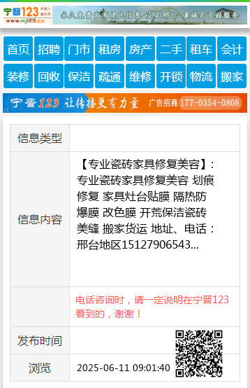 【专业瓷砖家具修复美容】:专业瓷砖家具修复美容 划痕修复 家具灶台贴膜 隔热防爆膜 改色膜 开荒保洁瓷砖美缝 搬家货运 地址、电话:邢台地区15127906543