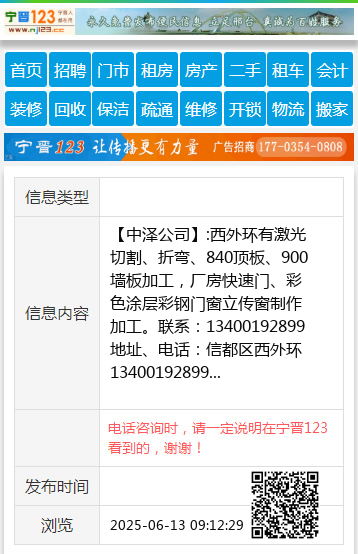 【中泽公司】:西外环有激光切割、折弯、840顶板、900墙板加工,厂房快速门、彩色涂层彩钢门窗立传窗制作加工。联系:13400192899 地址、电话:信都区西外环13400192899