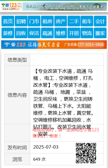 【专业改装下水道,疏通 马桶, 电工,空调维修,打孔改水管】:专业改装下水道,疏通 马桶, 地漏 ,菜盆 ,卫生间反味 ,更换卫生间铸铁管、马桶上下水。太阳能维修,更换上水管,真空管。空调维修移机加氟回收,水钻打眼儿。改装卫生间水管 ,安装花洒卫浴,换水龙头,换阀门,水龙头软管 ,取水管断丝 ,马桶漏水。家庭电工,换开关插座,电闸,装灯布线,查线路故障。换暖气片,地暖分水器,暖气拆装,专业清洗地暖 ,检测暗管漏水。地暖打压 3673300 地址、电话:031-3673300 |