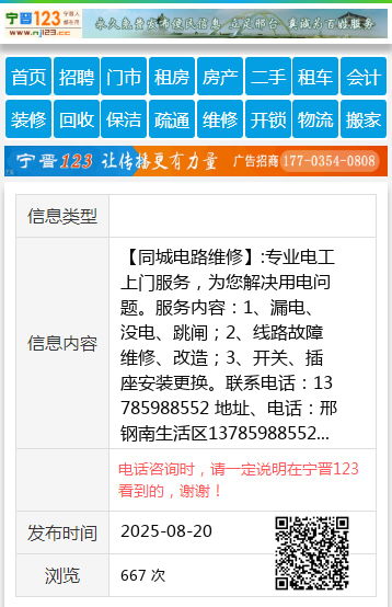 【同城电路维修】:专业电工上门服务,为您解决用电问题。服务内容:1、漏电、没电、跳闸;2、线路故障维修、改造;3、开关、插座安装更换。联系电话:13785988552 地址、电话:邢钢南生活区13785988552