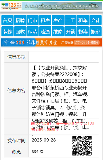 【【专业开锁换锁,指纹解锁,公安备案2222008】: 🔓】:🔓🔓🔓邢台市桥东桥西专业无损开各种防盗门锁、柜、汽车锁、文件柜(抽屉)锁、锁、电子锁等锁具。2、修锁,换锁各种防盗门锁,锁芯,升级超C级锁芯,柜、汽车锁、文件柜(抽屉)锁、锁、电子锁、闭门器、转闸门锁、防火门锁、门铃、猫眼(可以开孔)等3、配钥匙、匹配汽车芯片钥匙、遥控器、车库门遥控器、门禁卡等。一、我们的经营项目:1、承接安装、各类锁具工程;2、开、修各式柜、金库、保管箱;3、开、修各式办公锁具(老板台锁、档案柜锁、办公桌锁等) 地址、电话:邢台市区2222008--15533191758 |