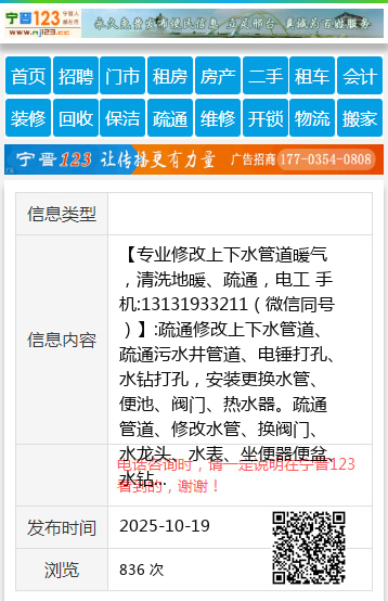 【专业修改上下水管道暖气,清洗地暖、疏通,电工 手机:13131933211(微信同号)】:疏通修改上下水管道、疏通污水井管道、电锤打孔、水钻打孔,安装更换水管、便池、阀门、热水器。疏通管道、修改水管、换阀门、水龙头、水表、坐便器便盆、水钻打孔,更换地漏、便池、阀门、热水器。修水管换阀门、水龙头、水表、维修更换坐便器、蹲便,家庭电工、 精准测漏水 地暖 暖气 自来水,地暖清洗 更换分水器。空调移机 维修 加氟 回收。 地址、电话:桥东0319-3333378;桥西0319-2222278 管道疏通 |