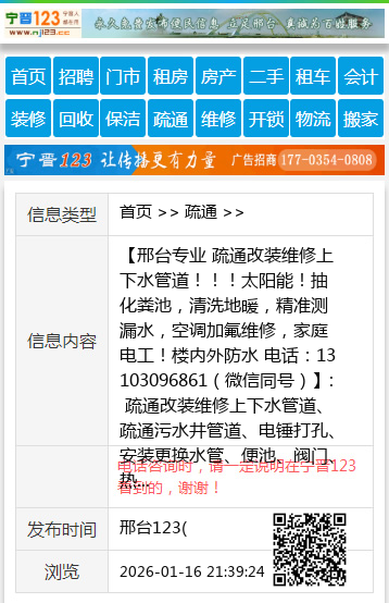 【邢台专业 疏通改装维修上下水管道!!!太阳能!抽化粪池,清洗地暖,精准测漏水,空调加氟维修,家庭电工!楼内外防水 电话:13103096861(微信同号)】: 疏通改装维修上下水管道、疏通污水井管道、电锤打孔、安装更换水管、便池、阀门、热水器。疏通管道、修水管、换阀门、水龙头、水表、坐便器便盆、皮碗、水钻打孔,卫生间防水,建筑杂活疏通管道 承接疏通各种疑难下水道、上下水安装 专业疏通改装上、下水管道、电锤打孔、便池阀门热水器。疏通管道修水管换阀门、水龙头、水表、坐便器便盆、皮碗、水钻打孔,家庭电工、卫生间防水、清洗地暖 精准测漏水 地暖 !!开换锁 !! 清洗太阳能 !!空调移机加氟维修!回收二手空调!!13933708733 地址、电话:桥西:2222338 桥东:3171110 管道疏通 【电话咨询时,请一定说明在邢台123看到的,谢谢!】 |