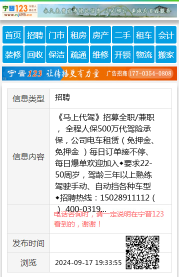 《马上代驾》招募全职/兼职, 全程人保500万代驾险承保,公司电车租赁(免押金、免押金 )每日订单接不停、每日爆单欢迎加入◆要求22-50周岁,驾龄三年以上熟练驾驶手动、自动挡各种车型◆招聘热线:15028911112() 400-0319-717 地址:中华路168号(一中对面58家政二楼)