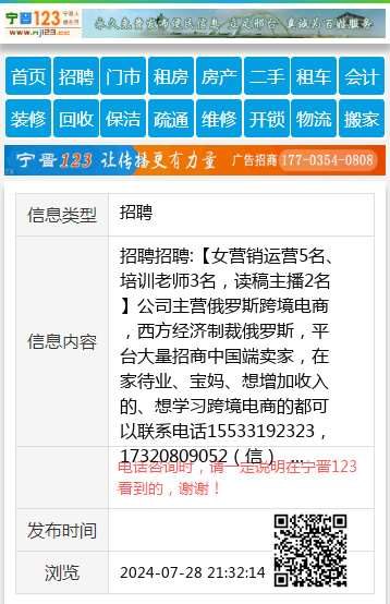 招聘招聘:【女营销运营5名、培训老师3名,读稿主播2名】公司主营俄罗斯跨境电商,西方经济制裁俄罗斯,平台大量招商中国端卖家,在家待业、宝妈、想增加收入的、想学习跨境电商的都可以联系电话15533192323,17320809052(信) 聘