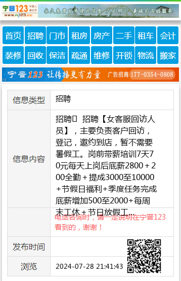 招聘 招聘【女客服回访人员】,主要负责客户回访,登记,邀约到店,暂不需要暑假工。岗前带薪培训7天70元每天上岗后底薪2800+200全勤+提成3000至10000+节假日福利+季度任务完成底薪增加500至2000+每周末工休+节日放假工作地点未来广场联系电话13292107363 聘