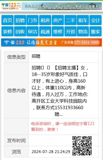 招聘 【招聘主播】女,18--35岁形象好气质佳,口才好,有上进心,身高160以上,体重110以内,高新待遇,月入过万,工作地点:高开区工业大学科技园院内,联系方式15531933660 聘