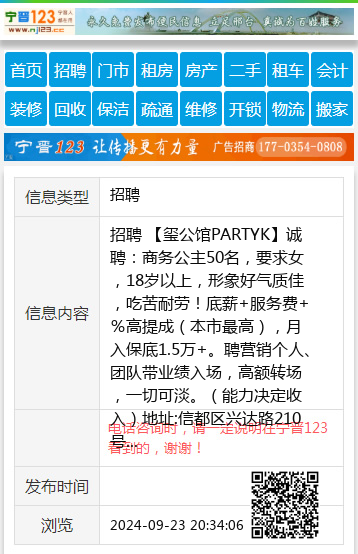 招聘 【玺公馆PARTYK】诚聘:商务公主50名,要求女,18岁以上,形象好气质佳,吃苦耐劳!底薪+服务费+%高提成(本市最高),月入保底1.5万+。聘营销个人、团队带业绩入场,高额转场,一切可淡。(能力决定收入)地址:信都区兴达路210号以上职位均带薪假期,高福利,高收入!(小白可带薪培养)电话:(下午三点后致电)营销部(17503374567程总)行政部(19931902120郭总) 聘 |