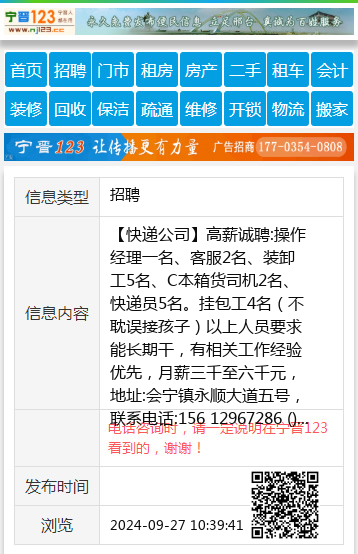 【快递公司】高薪诚聘:操作经理一名、客服2名、装卸工5名、C本箱货司机2名、快递员5名。挂包工4名(不耽误接孩子)以上人员要求能长期干,有相关工作经验优先,月薪三千至六千元,地址:会宁镇永顺大道五号,联系电话:156 12967286 ()。另招万城新天地瑞幸咖啡二楼【聚会游戏社】招聘小时工或长期工电话18132199975 |