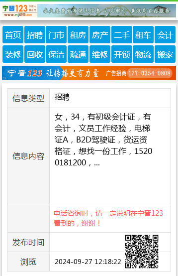 女,34,有初级会计证,有会计,文员工作经验,电梯证A,B2D驾驶证,货运资格证,想找一份工作,15200181200,