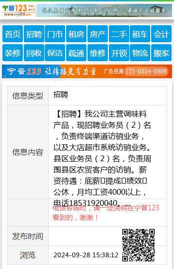 【招聘】我公司主营调味料产品,现招聘业务员(2)名,负责终端渠道访销业务,以及大店超市系统访销业务。县区业务员(2)名,负责周围县区农贸客户的访销。薪资待遇:底薪➕提成➕绩效➕公休,月均工资4000以上,电话18531920040。