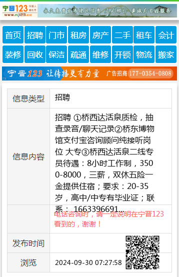 招聘 ①桥西达活泉质检,抽查录音/聊天记录②桥东博物馆支付宝咨询顾问纯接听岗位 大专③桥西达活泉二线专员待遇:8小时工作制,3500-8000,三薪,双休五险一金提供住宿;要求:20-35岁,高中/中专有毕业证;联系: 16633966915/17633190052 聘