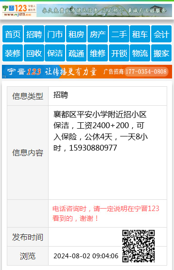 襄都区平安小学附近招小区保洁,工资2400+200,可入保险,公休4天,一天8小时,15930880977