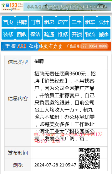 招聘无责任底薪3600元,招聘【销售经理】,不用找客户,因为公司全网推广产品,并给员工推荐客户,自己只负责邀约跟进,目前公司员工人均收入一万+,朝九晚六不加班!办公环境优美,帅哥美女多多!工作地址:河北工业大学科技园新公司,发展空间广阔,每月轻松收入过万,已有新人入职当月就挣到2万+的案例,联系电话18931925750 聘 |