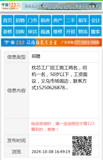枕芯工厂招工男工两名,司机一名,50岁以下,工资面议,义乌市场周边,联系方式15250626878