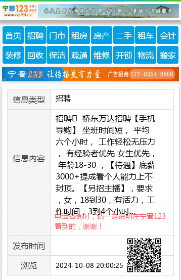 招聘 桥东万达招聘【手机导购】 坐班时间短, 平均六个小时, 工作轻松无压力, 有经验者优先 女生优先, 年龄18-30 ,【待遇】底薪3000+提成看个人能力上不封顶。【另招主播】,要求,女,18到30,有活力,工作时间,3到4个小时,3500+提成 电话:13230959355 聘