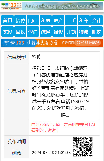 招聘 太行路(麒麟湾)尚客优连锁酒店招客房打扫服务数名女50岁下,性格好吃苦耐劳有团队精神.上班时间8点到5点半,底薪加提成三千五左右,电话15903198123,勿扰欢迎到店咨询。 聘