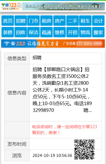 招聘【邯郸路口火锅店】招服务员数名工资3500公休2天,洗碗勤杂1名工资2800公休2天,长期小时工9-14点50元,下午5-10点60元,晚上10-03点65元。电话18932998970 聘