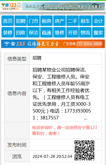 招聘某物业公司招聘保洁、保安、工程维修人员。保安和工程维修人员年龄55周岁以下,有相关工作经验者优先。(工程维修人员有电工证优先录用,月工资3000-3500元)电话:17733930051;3817557 聘